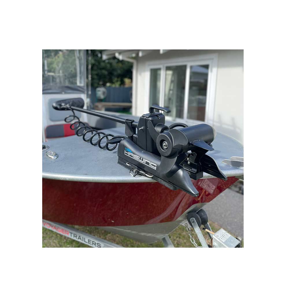 The Haswing Cayman B Gen1.6 GPS Trolling Motor offers wireless control via remote, foot pedal, or smartphone. Featuring Anchor Lock, Heading Lock, Cruise Control, and GPS navigation, it’s perfect for both salt and freshwater use. Includes a redesigned wireless remote, LED battery monitor, and easy mounting options. Compatible with the Helmsman App for advanced features like route tracking and speed control.